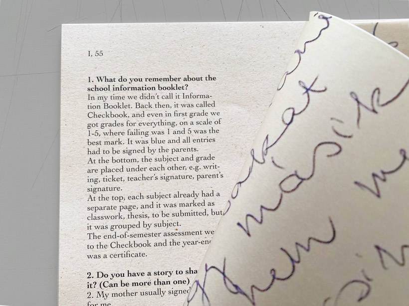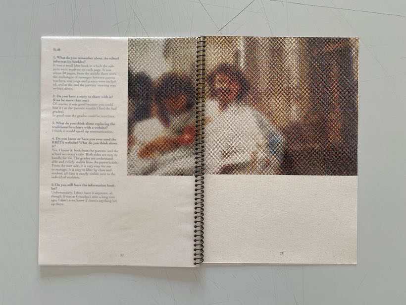 El sistema del tájékoztató füzet cambió por completo en 2019, cuando introdujeron la nueva plataforma digital llamada KRETA y el cuadernillo quedó en el olvido. La motivación para este proyecto surgió del certificado escolar de mi bisabuela y otros documentos antiguos de mi familia durante sus años escolares, como fotografías antiguas de su graduación, cuadernillos informativos, libros de canto, etc. Decidí investigar sobre el cuadernillo informativo porque es una herramienta que se ha utilizado a lo largo de generaciones para la comunicación entre profesores y padres, y esta serie de publicaciones artísticas rinde homenaje al objeto sentimental del cuadernillo.